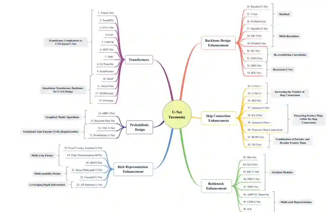 我们的综述涵盖了最新的基于U-Net的医学图像分割文献,并讨论了截至2022年9月提出的100多种方法。我们对这些方法的不同方面进行了广泛的回顾和阐述,包括关于普通U-Net的网络架构增强、医疗图像数据模式、损失函数、评估指标及其关键贡献。根据UNet及其变体的快速发展,我们提出了在我们的分类法中被频繁引用的方法的总结。我们将U-Net变体分为以下几类: