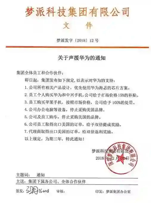 有一家叫梦派科技的公司甚至公开发布了一篇题为《关于声援华为的通知》公告。