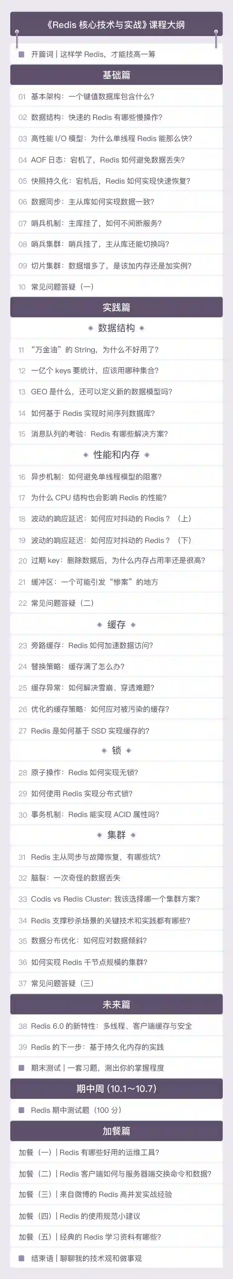 这样,才能透彻理解 Redis,建立起结构化的知识体系,快速找到引发问题的关键因素,甚至整理成 Checklist,作为遇到问题时信手拈来的“锦囊妙计”。这也是蒋老师在开篇词里提到的,设计这个专栏的出发点。类似的干货有很多,具体可以看看目录: