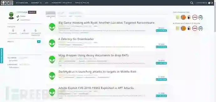 AlienVault还提供了一个由OTX免费的全球威胁仪表盘,可以在https://www.alienvault.com/open-threat-exchange/dashboard#/threat /top获得,该仪表盘展示了来自OTX社区的一些威胁数据。接下来介绍个人对OTX的使用: