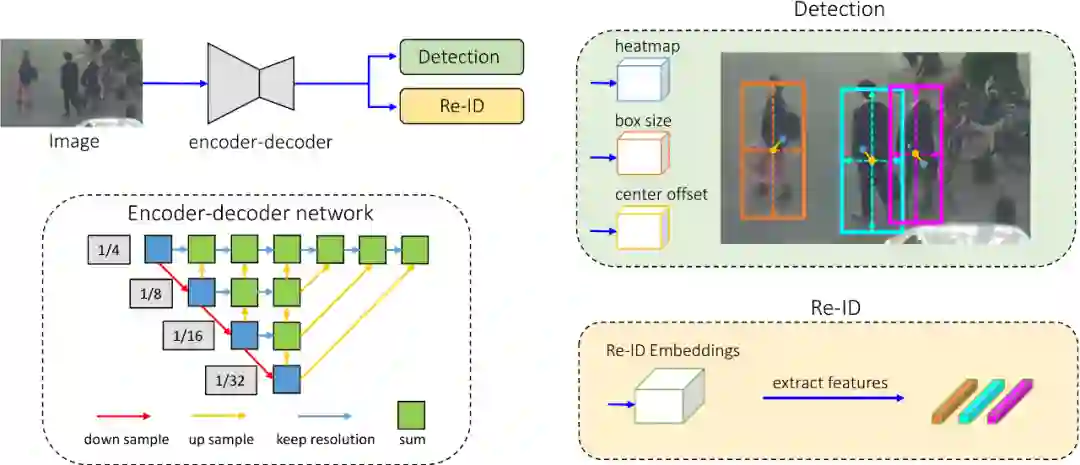 我们以 CenterNet [3] 为基础,加入 Re-ID 分支,提出了 FairMOT 方法,使其能够同时进行物体检测和跟踪,下图展示了方法的框图。简单来讲,FairMOT 会对每一个像素进行预测,预测其是否是物体的中心、物体的大小和以其为中心的图像区域的 Re-ID 特征。检测和跟踪两个任务都是以“当前像素”为中心,所以不存在对齐的问题,也不存在严重的顾此失彼的不公平问题,这也是称这个方法为 FairMOT 的原因。
