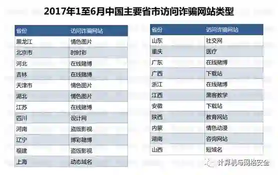 报告期内,北京市、河北省等访问的诈骗网站类型主要以网络赌博为主,而黑龙江省、天津市则以色情论坛为主。