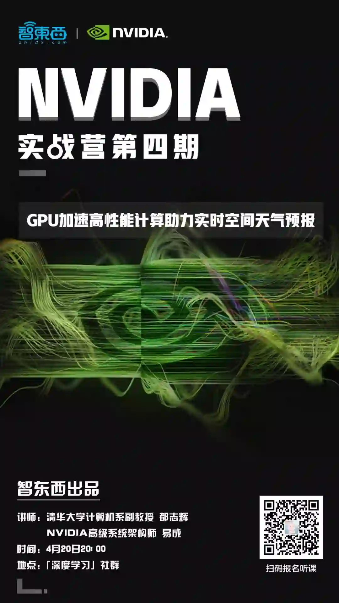 #智东西出品#本周五晚8点,NVIDIA实战营第四期将开讲,主题为《GPU加速高性能计算助力实时空间天气预报》,由清华大学计算机系副教授都志辉、NVIDIA高级系统架构师易成共同主讲,长按二维码报名,免费入群听课。
