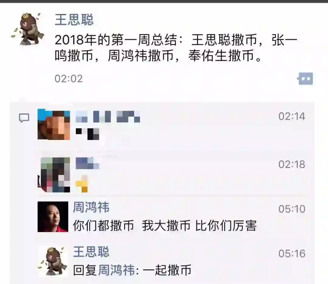 8日晚,一则疑似王思聪的朋友圈刷屏。“2018年的第一周总结:王思聪撒币,张一鸣撒币,周鸿祎撒币,奉佑生撒币。”周鸿祎和奉佑生随后接招,暗示自己的平台会撒到最后。