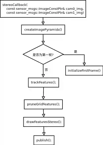 本文主要针对2017年Kumar实验室开源的S-MSCKF进行详细分析,其实这篇文章整体思路与07年提出的基本上是一脉相承的.作为一个VIO的前端,MSCKF采用的是光流跟踪特征点的方法,特征点使用的是FAST特征,另外这是MSCKF双目的一个实现,双目之间的特征点匹配采用的也是光流,这与传统的基于descriptor匹配的方法不同.前端部分其实相对简单,整个前端部分基本在 image_processor.cpp中实现.