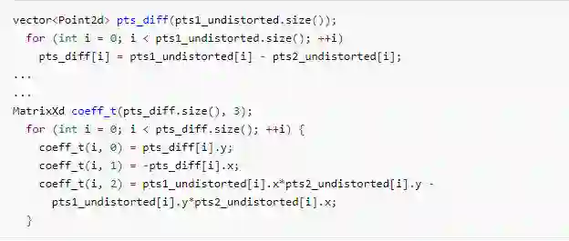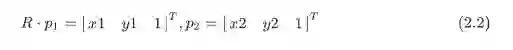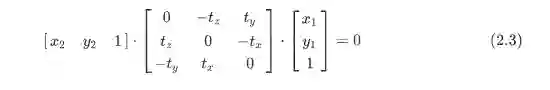 至于这个模型是怎么选出来的呢? 假设一共有N个inliers点对,那么根据式(2.4)势必会得到一个N*3 * 3*1 = N(0)的等式.但事实上由于误差和outliers的存在,最终结果不可能为零,我们取两个点将式子分块,并且只考虑两个点的情况,那么将会有: