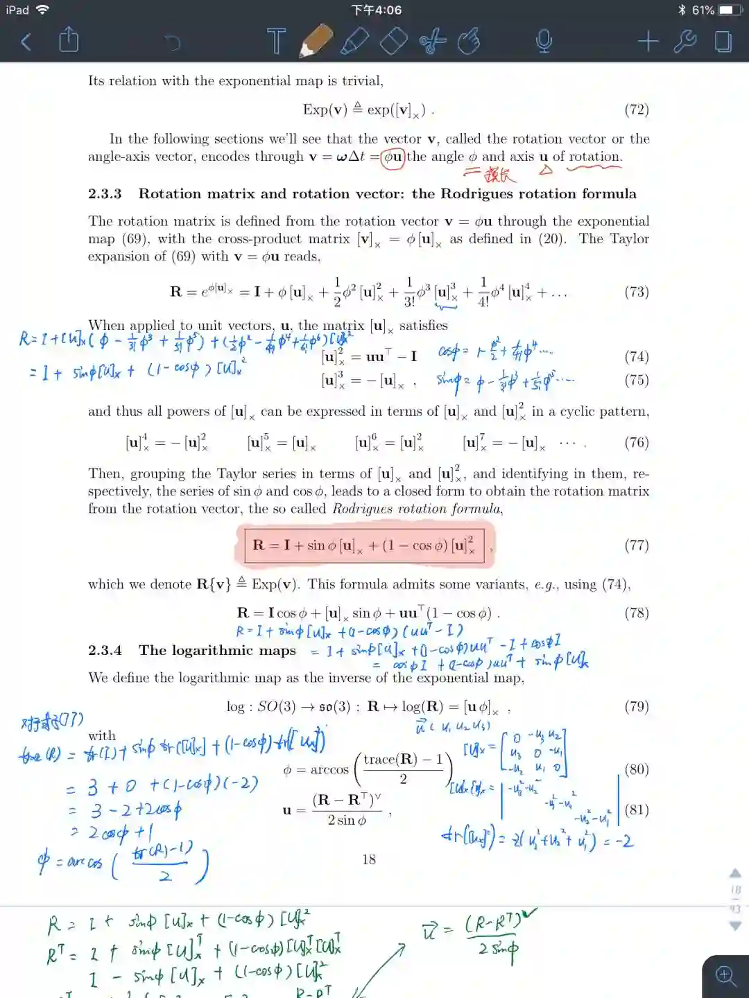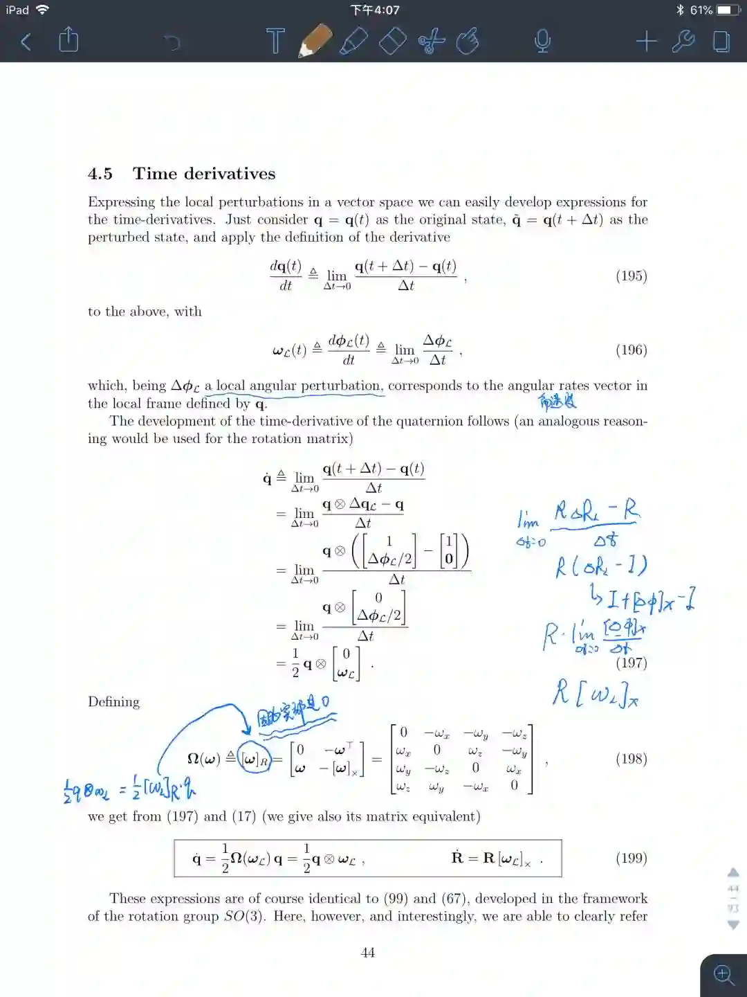 其实原理部分相当重要,包括你对error-state Kalman Filter的理解,但是如果要从头讲起的话可以说篇幅太长,考虑到做SLAM的同学们基本上都应该知道这本书 Quaternion kinematics for the error-state Kalman filter, 这本书会让你在四元数,SO3,IMU的模型以及基于IMU的ESKF(error-state Kalman Filter)都会有比较深刻的理解,对应这本书我也做了很多注释,关于基于四元数原理部分由于篇幅限制,我这里不想做太多的说明,但是接下来在讲解S-MSCKF原理部分我们会将参考公式附上.下面是一些我在这本参考资料中的注释图.