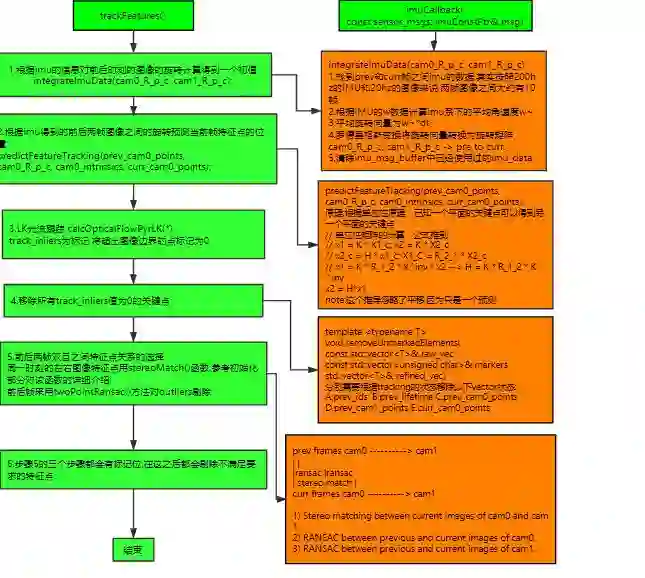 当第一帧初始化完成之后,后面帧则只需要进行跟踪第一帧的特征点,并且提取新的特征点,整个流程如下: