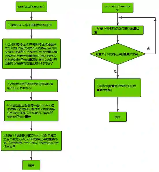 如果一直tracking的话那么随着时间流逝,有些特征会消失,有些可能也会有累计误差,所以我们势必要添加一些新的特征,这个步骤正是在跟踪上一帧特征之后要做的,因为stereoMatching 和twoPointRansac都会剔除一些outliers,那我们需要提取新的特征保证能一直运行下去.