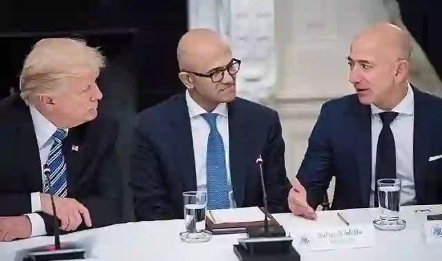 图:美国总统特朗普与纳德拉、亚马逊CEO贝佐斯谈论