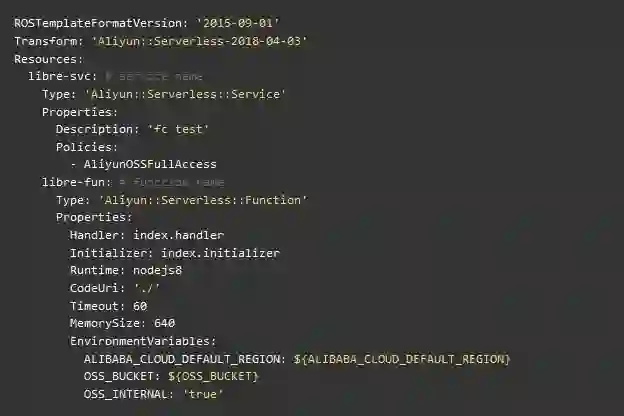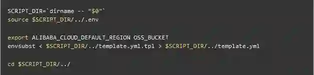 真实场景下,把秘钥和一起变量写在 template.yml 里并不合适。为了做到代码和配置相分离,上面使用了变量占位符 ${ALIBABA_CLOUD_DEFAULT_REGION} 和 ${OSS_BUCKET} 。