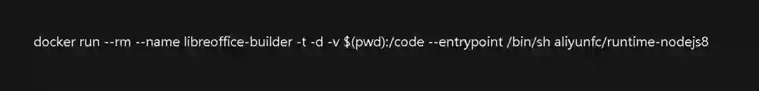 我们会采用 fc-docker 提供的 aliyunfc/runtime-nodejs8:build docker 镜像进行编译。fc-docker 提供了一系列的 docker 镜像,这些 docker 镜像环境非常接近函数计算的真实环境。因为我们打算把 libreoffice 跑在 nodejs8 环境中,所以我们选用了 aliyunfc/runtime-nodejs8:build,build 标签镜像相比于其他镜像会多一些构建需要的基础包。
