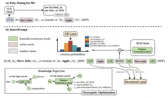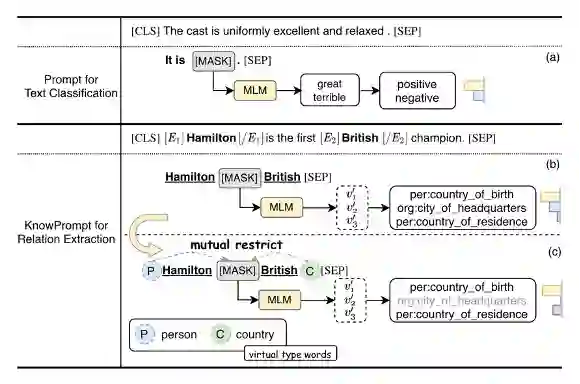 因为一个经典的提示由两个部分组成,即模板和一组标签词映射,我们提出了虚拟类型词(实体)和虚拟答案词(关系)的构建,用于关系抽取任务的知识注入。