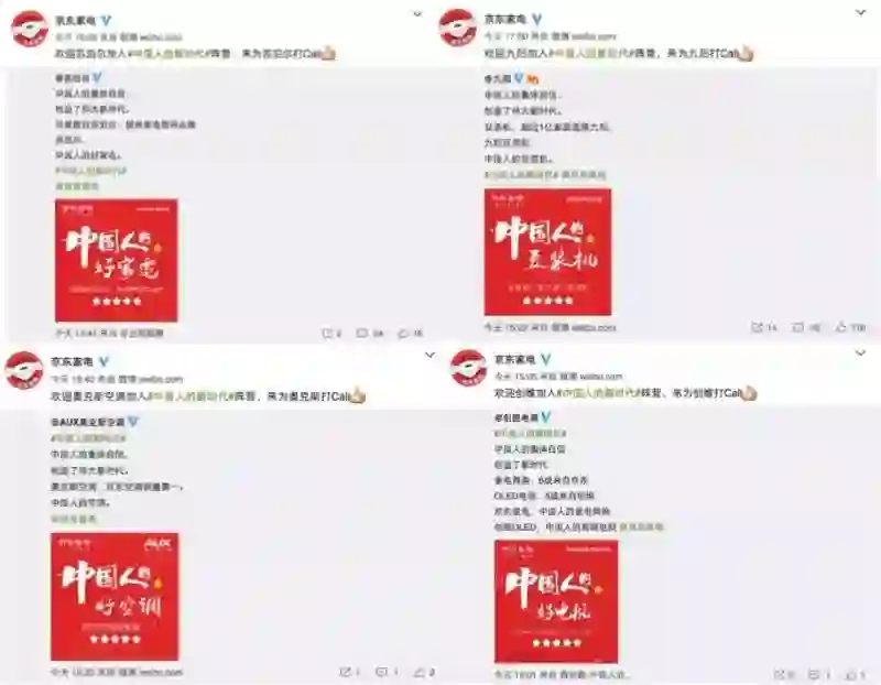 京东家电土豪般的全量投放,不仅刷新了腾讯朋友圈广告的投放记录,其一水的点赞评论势必也会创造最高的用户互动量。同时,美的、格力、海尔、奥克斯、创维、康佳、方太、格兰仕、老板、九阳、万和、林内等近百个国内主流家电厂商也通过微博互动的形式响应京东家电的广告号角,针对 #中国人的新时代# 这一微博话题各自抒发中国人的集体自信,直指国人内心,民族自豪感瞬间爆棚有木有!