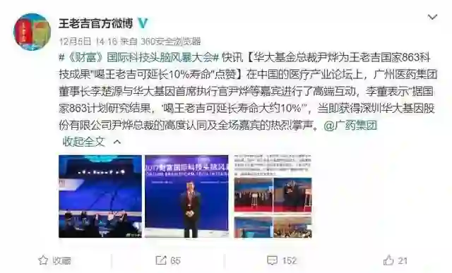这条“延寿”消息,其实王老吉4年前就已经发过了——早在2013年6月,广药就曾经在广州东方宾馆开了个《诺奖得主携手SGS启动王老吉凉茶国际标准研究暨王老吉凉茶国家863计划最新科研成果发布会》,会上宣布:王老吉凉茶能延寿。
