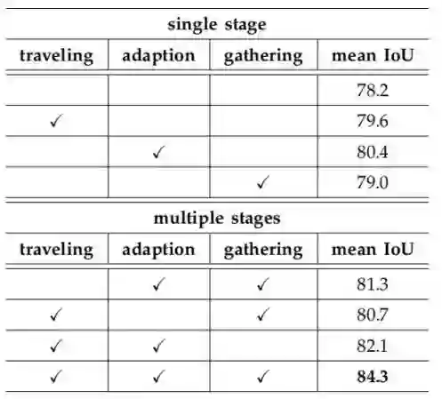 表2为TAGNet在Cityscapes数据集上traveling、adaption、gathering三个模块的消融实验,可以看到三个模块均能给baseline模型带来分割效果的提升。