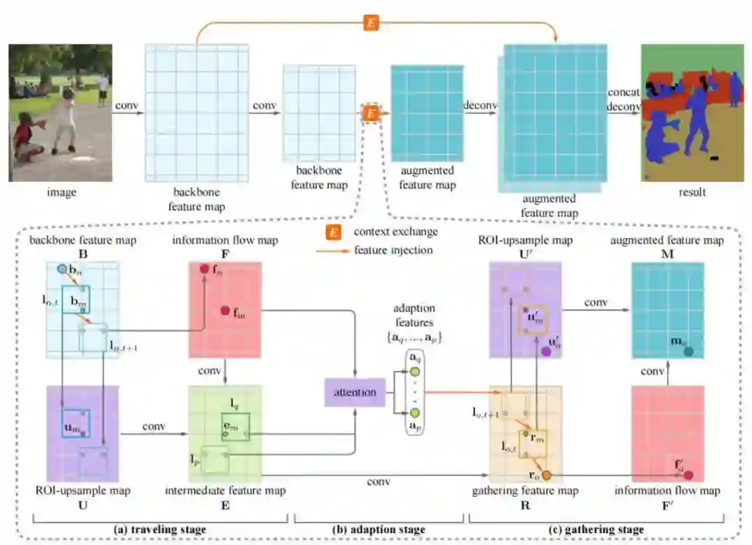 图2是模型的整体结构图。首先对输入图像进行裁剪和将裁减之后的图像通过骨干网络得到特征图。然后计算上下文路径,并根据这些上下文路径计算得到外观特征图,并根据上下文路径计算特征图,包括三个部分。第一部分为traveling stage,traveling stage中源像素沿着一系列区域移动其深层特征,并产生一个信息流。第二部分为adaption stage,适应不同的信息流,这些信息流通过可配置的融合区域,并合并成更少但更具代表性的信息流。第三部分为gathering stage, 代表性信息流沿着相关区域序列收集在目标像素处,生成信息增强的特征图。然后我们根据融合系数对增强特征图进行融合得到语义特征图