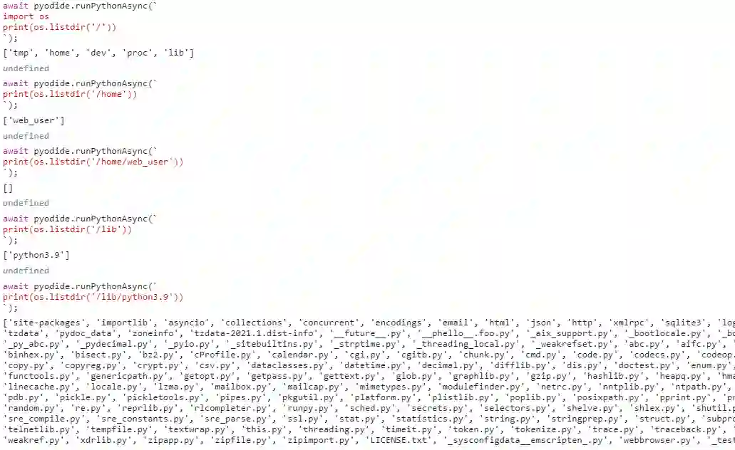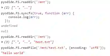 // 创建挂载点pyodide.FS.mkdir('/mnt');// 挂载文件系统pyodide.FS.mount(pyodide.FS.filesystems.IDBFS, {}, '/mnt');// 写入一个文件pyodide.FS.writeFile('/mnt/test.txt', 'hello world');// 真正的保存文件到持久文件系统pyodide.FS.syncfs(function (err) {console.log(err);});