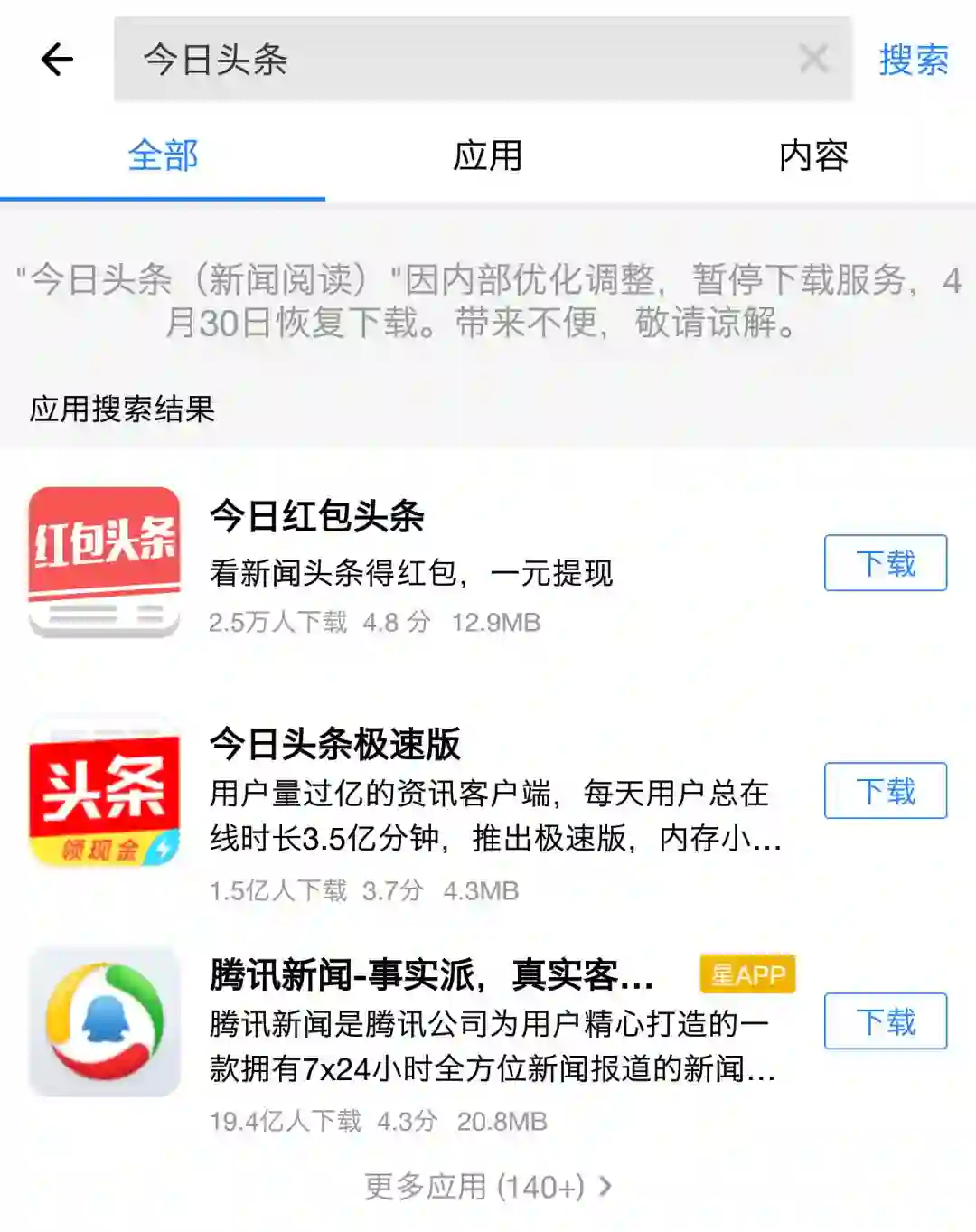 经北京日报记者核实,有关部门要求各家应用商店在 9 日下午 3 点前将通知执行完毕,要求内容是「为依法规范传播秩序,各互联网应用商店暂停今日头条、凤凰新闻、网易新闻和天天快报四款移动应用程序的下载服务。」