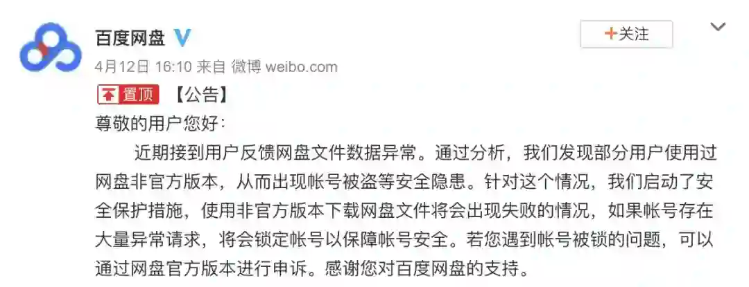 4 月 12 日晚,百度网盘 发布公告 称,近期接到用户反馈网盘文件数据异常,通过分析,发现部分用户使用过网盘非官方客户端,从而出现帐号被盗等安全隐患。对此,百度网盘启动安全保护措施,使用非官方版本下载网盘文件将会出现失败的情况。另外,如果帐号存在大量异常请求,将会被锁定帐号以保障帐号安全。