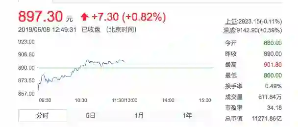 在二级市场上,贵州茅台已连跌两日,5月7日报收890元/股。今天截止发稿前,茅台报价897.3元/股,市值11271.86亿元。