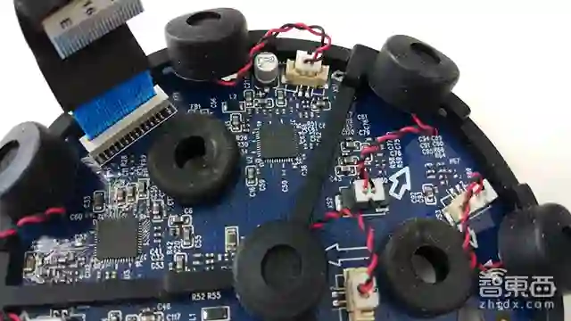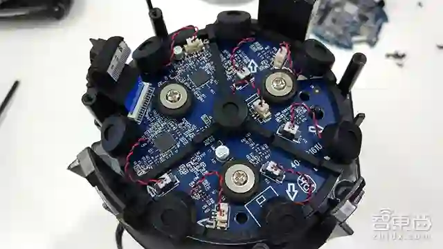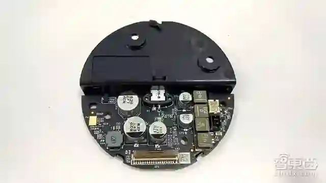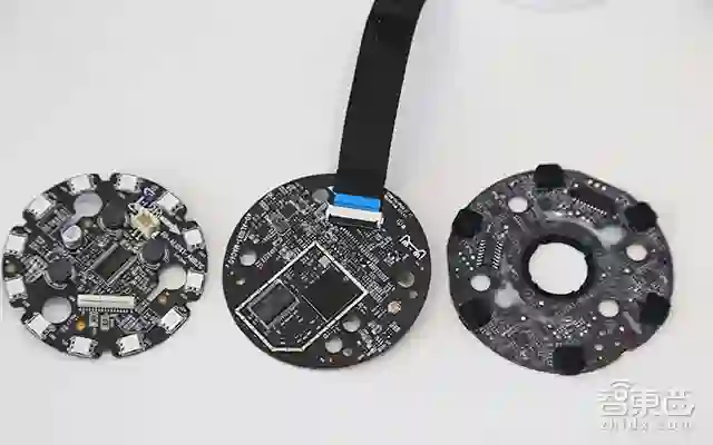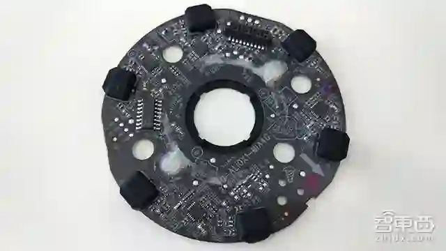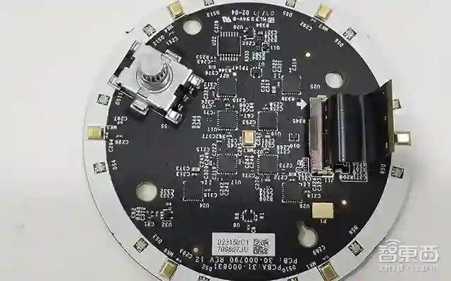麦克风阵列板位于主板的上方,而这通过排线和分离插座相连,二者之间还加有黑灰色导光塑料板。其中麦克风阵列板通过双面胶与顶部相连,小心拆开后是这样的!6颗麦克风环形至于面板边缘一周,并覆有黑色橡胶。