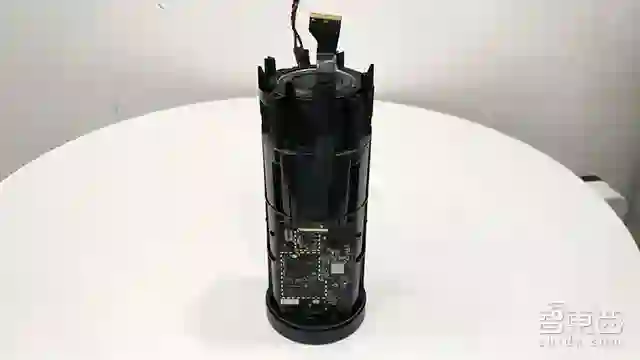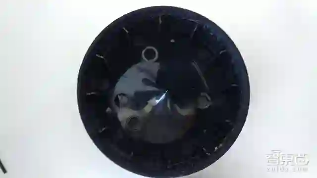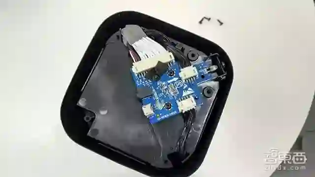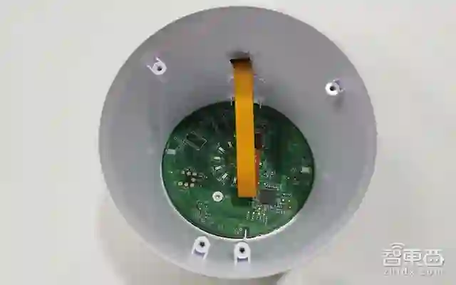 谷歌Home的底部灰色网套可直接拔下,露出了黑色机身,能看到三个锥形纸盆。移去上部的环形螺丝钉,就可以拆下白色顶壳,一条排线连接主控电路板和顶部的麦克风阵列板。