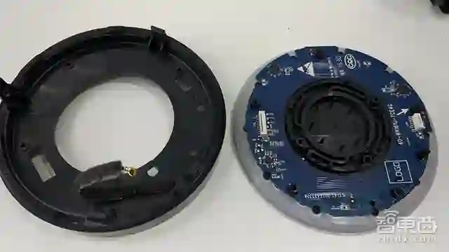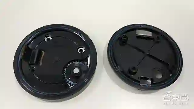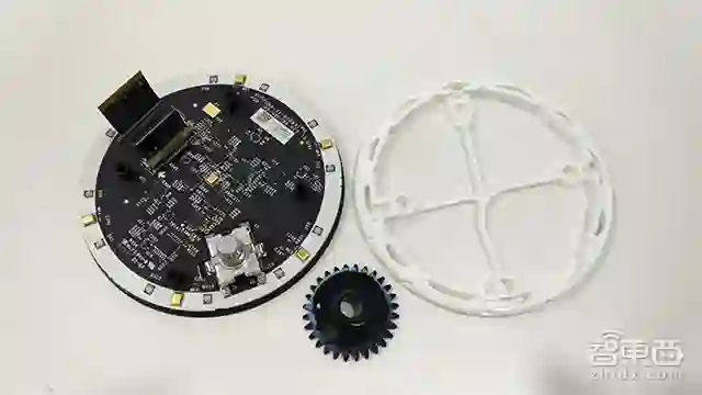 接着,撬下机身,剩下Echo音箱的顶部,里面主要为麦克风阵列板。移出塑料壳上的螺丝钉,可看到Echo的齿轮结构,还记得通过转动圆形光环来调节音量的设置吗?没错正是靠这个齿轮结构驱动的!