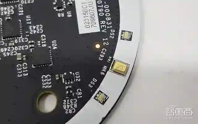 一层一层褪去麦克风阵列板上方的塑料壳和支架,终于见到了它的真容。首先进入眼帘的就是Echo的6+1麦克风阵列,其中6个麦克风位于环形面板边缘,另一颗位于正中央。该MEMS麦克风由楼氏电子提供, 麦克风阵列则由Echo团队自己负责。