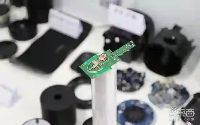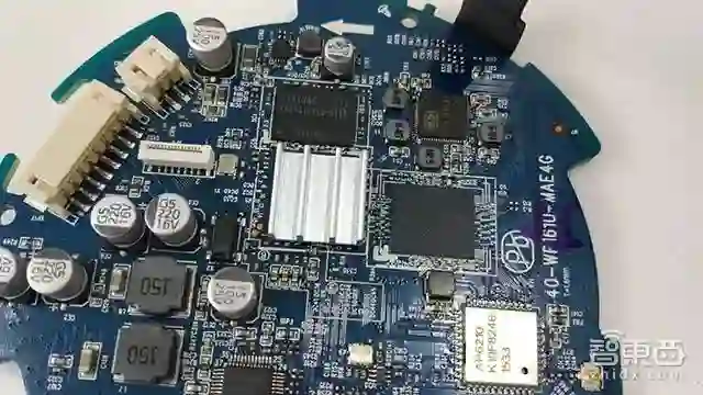 回到智能音箱机身,在机身的顶部是主控面板,上面布满了密密麻麻的元器件。而在主控芯片上还加了散热片,尽管遮住了芯片,我们向付强求证,其采用的是全志科技的R16芯片。