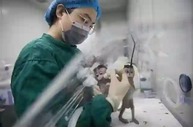 工作人员在给生物节律紊乱体细胞克隆猴喂食