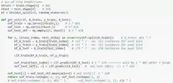 最后 ,放出一张Python的Code,在网上为数不多的stacking内容里, 这个几行的code你也早就看过了吧,我之前一直卡在这里,现在加上一点点注解,希望对你有帮助: