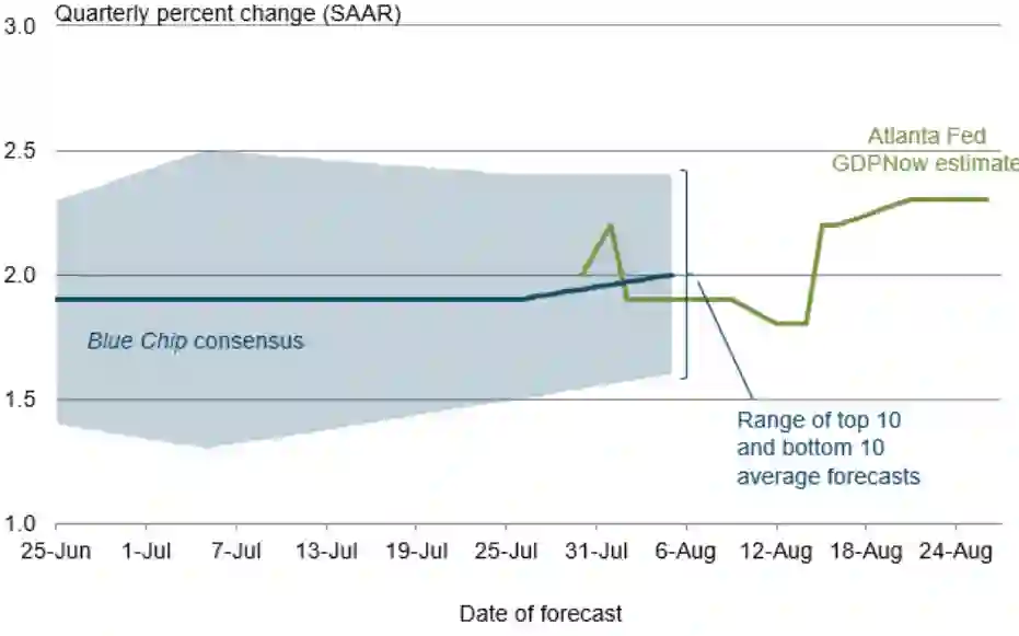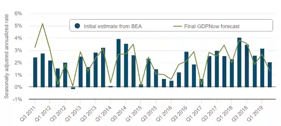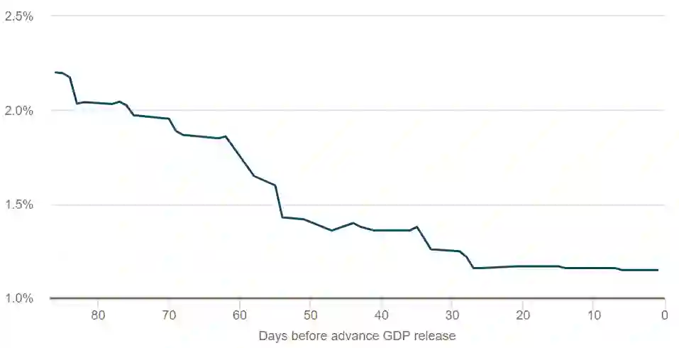 美国亚特兰大联邦储备银行发布了一个名为GDP NOW 的nowcast模型,它基于当前测量季度的可用数据对当前季度实际GDP增长的运行做出实时估计,估计值每月更新6-7次。