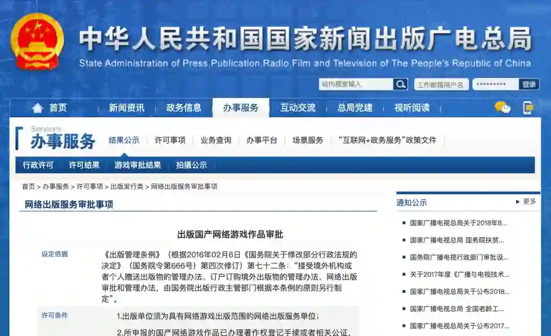 中国的国家新闻出版广电总局4月19日发布通知,说明了申请在中国出版网络游戏作品许可所需提交的材料以及许可程序。出版单位现在必须提交更多信息,包括游戏防沉迷系统说明以及游戏脚本等。
