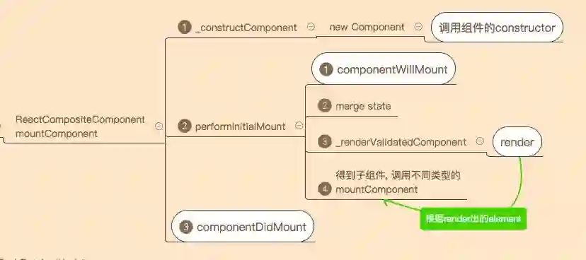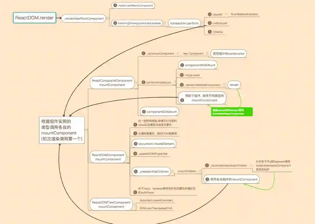 刚开始, React给要渲染的组件从最顶层加了一个ReactCompositeComponent类型的 topLevelWrapper来方便的存储所有更新, 因此初次递归是从 ReactCompositeComponent 的mountComponent 开始的, 这个过程会调用组件的render函数(如果有的话), 根据render出来的elements再调用instantiateReactComponent实例化不同类型的组件, 再调用组件的 mountComponent, 因此这是一个不断渲染不断插入、递归的过程.