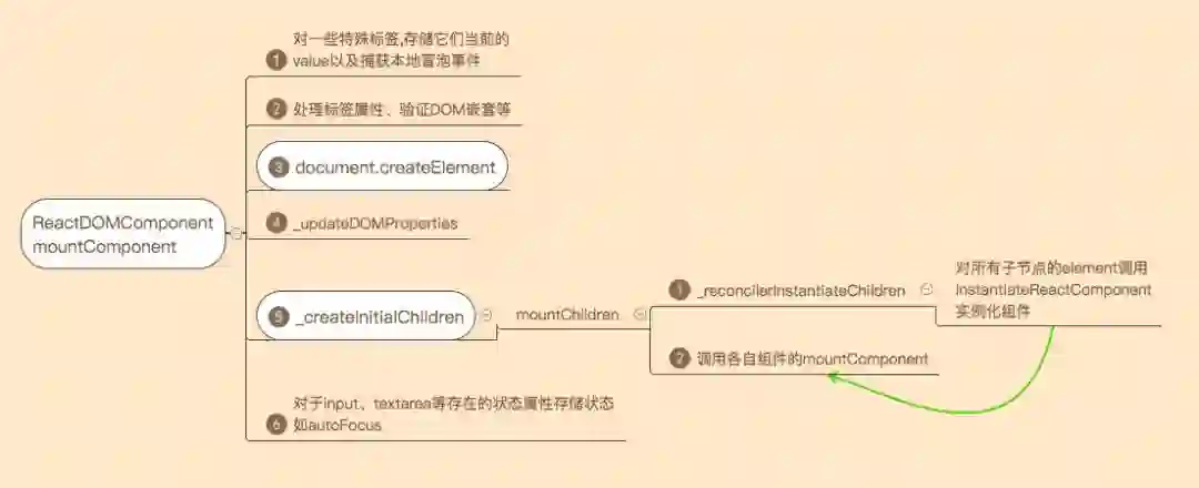 ReactCompositeComponent的mountComponent过程中会先调用render(Composite类型 )生成组件的elements tree, 然后顺着props.children, 不断实例化, 不断调用各自组件的mountComponent 形成循环