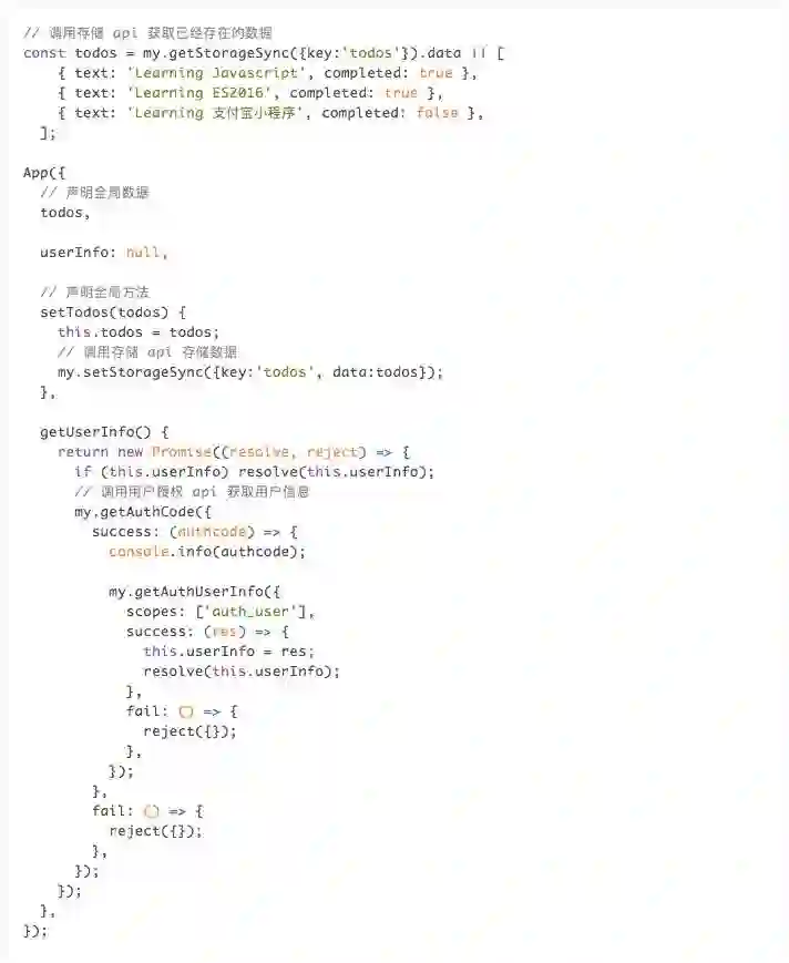 app.js 是小程序公共的逻辑脚本文件,在这个文件中可以监听小程序的生命周期,声明全局变量,调用框架提供的丰富 API,如以下所示的存储以及获取用户信息 API,更多 API 参见 API 文档(https://docs.alipay.com/mini/api)。