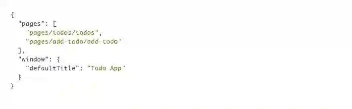 在这个示例中,我们有两个页面,Todo List 页面和 Add Todo 页面,他们都在 pages 目录下。小程序的所有页面路径必须写在 app.json 中,路径从项目根目录开始且不能包括后缀名,pages 的第一个页面就是小程序的首页。