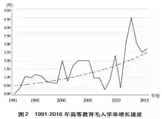 根据1990年以来的我国高等教育毛入学率(见表四),本研究计算得出高等教育毛入学率的逐年增长速度,并绘制了高等教育毛入学率增长速度图(见图2)。可以看出,自1991年以来,我国高等教育毛入学率增长速度均为正值,表明高等教育毛入学率一直处于增长态势,高等教育毛入学率与时间具有高度一致性。同时,高等教育毛入学率增长速度呈现波动状态中的加快趋势,增长速度的趋势线表明了这一特征。高等教育毛入学率的这种变化特征表明高等教育毛入学率随着时间的推移呈现非线性、增长速度先缓慢增加而后快速增加的增长趋势。