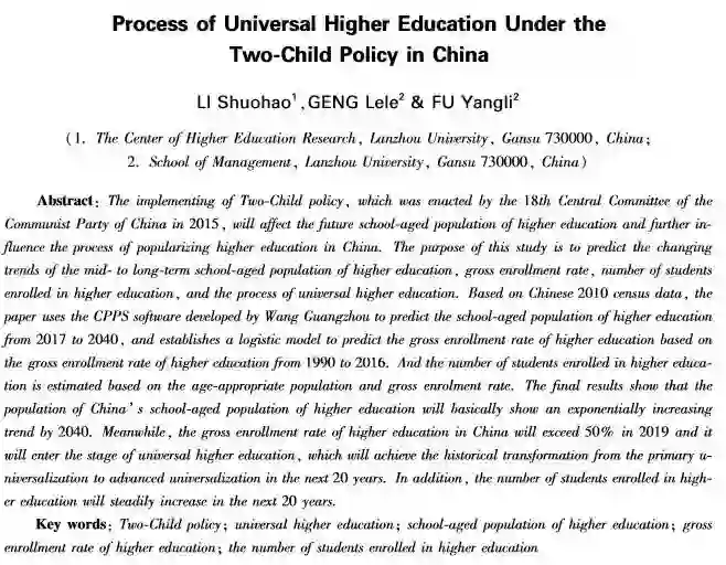 “全面二孩”政策的实施将对我国社会发展产生广泛而深远的影响,我国高等教育普及化进程也将受该政策的影响。本研究依据相关理论并结合实际构建了适龄人口预测模型和基于Logistic曲线的高等教育毛入学率预测模型,得出了我国2017-2040年的高等教育适龄人口变化趋势,并预测了我国高等教育普及化发展趋势以及高等教育在校生数变化趋势。