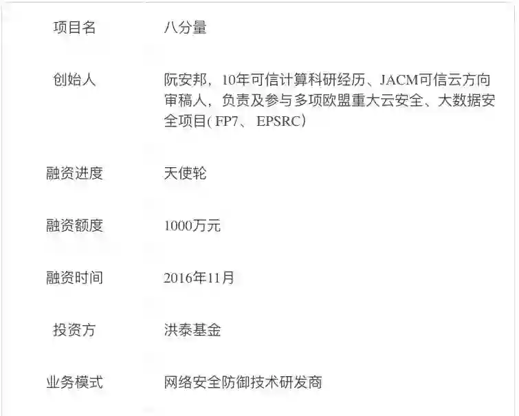 牛津大学博士阮安邦创办的“八分量”,便基于可信计算和异构共识区块链技术,对企业、政府等的服务器进行监控,构建持续免疫未知威胁的能力。其产品可在1秒内感知上万台服务器异常进程加载,10秒内感知异常操作行为,15秒内自动部署对抗和反击措施。
