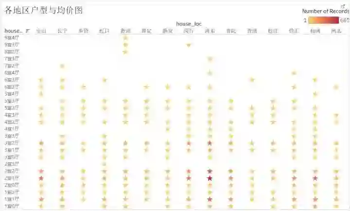 这是一个各地区的房源的户型图,每一个五角星的颜色越深,说明该类户型在该地区越多。这样我们可以直观看见,整个上海的2室1厅和2室2厅是最多的,其中浦东的2室1厅尤其(665个)。