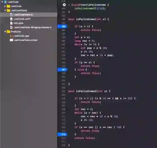 关于算法练习我们都会想到去LeetCode刷题。虽然LeetCode支持Swift答题,但是让人不爽的是有些处理字符串的题,用Swift作答会超时,所以笔者在练习时主要使用C和Swift作答。有时也会使用OC先理清思路,再使用其他语言进行作答。毕竟有些题需要边写边想,还有些需要进行调试才行。所以这也是用Playground不方便的地方,它不能进行断点调试。有了这些前提我就在想怎么才能使用现在工具,更好的进行算法题的练习呢?我想到了Xcode的单元测试,我们知道在继承自XCTestCase的类中实现以test为前缀的方法时,该方法前会生成一个菱形指示符,鼠标置于其上时会显示运行按钮,我们就可以通过该按钮运行测试用例,同时还支持断点调试。例如下图中的判断是否为回文数一题: