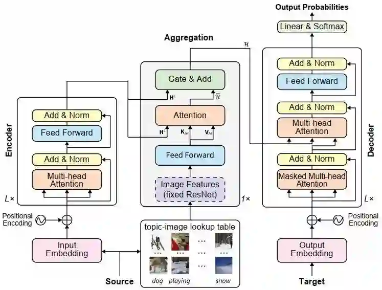 本文提出了一种简单、有效的多模态视觉知识融合方法——首先构建从主题词到图片的查询表,然后对输入句子找到相关的图片,然后使用ResNet提取图片信息融入到机器翻译模型中。