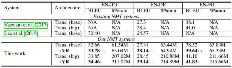 可以看到,和基线模型(Trans.(base/big))相比,本文的方法(+VR)在三个数据集上都能得到显著的提升,平均提升约一个BLEU值。同时,只引入了很少的参数量,这就不会使训练时间几乎不会增加。