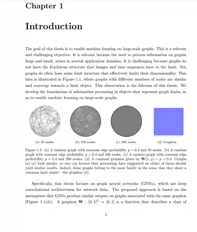 然而,从共享结构属性的意义上来说,大型图通常可以被识别为彼此相似。因此,我们可以预期,处理这些图上支持的数据应该会产生类似的结果,这将减轻大尺寸的挑战,因为我们可以为小图设计GNN,并将它们转移到更大的图上。在这篇论文中,我将这种直觉形式化,并表明当这些图属于同一个“族”时,这种图的可移植性是可能的,其中每个族由不同的图元标识。