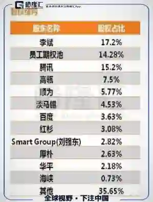 根据蔚来汽车的股权结构,创始人李斌占比17.2%,为最大股东,腾讯占比15.2%,为第二大股东,高瓴资本、顺位资本、淡马锡、百度、红山、刘强东等居前十大股东之列。