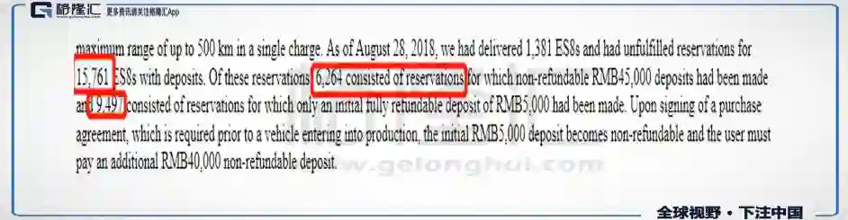 根据公司最新公布的招股书,截至今年8月28日,蔚来汽车的订单总数为17142辆,包括已交付的1381辆,和未交付的15761辆。这15761辆中,6264辆为已缴纳45000元押金的不可退款订单,其余的9497辆为缴纳5000元押金的可退款订单。
