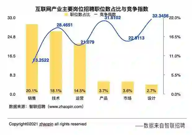 从智联招聘发布的《2021年互联网产业求职指南》来看,运营岗的招聘需求量之高,位居互联网产业前3名。