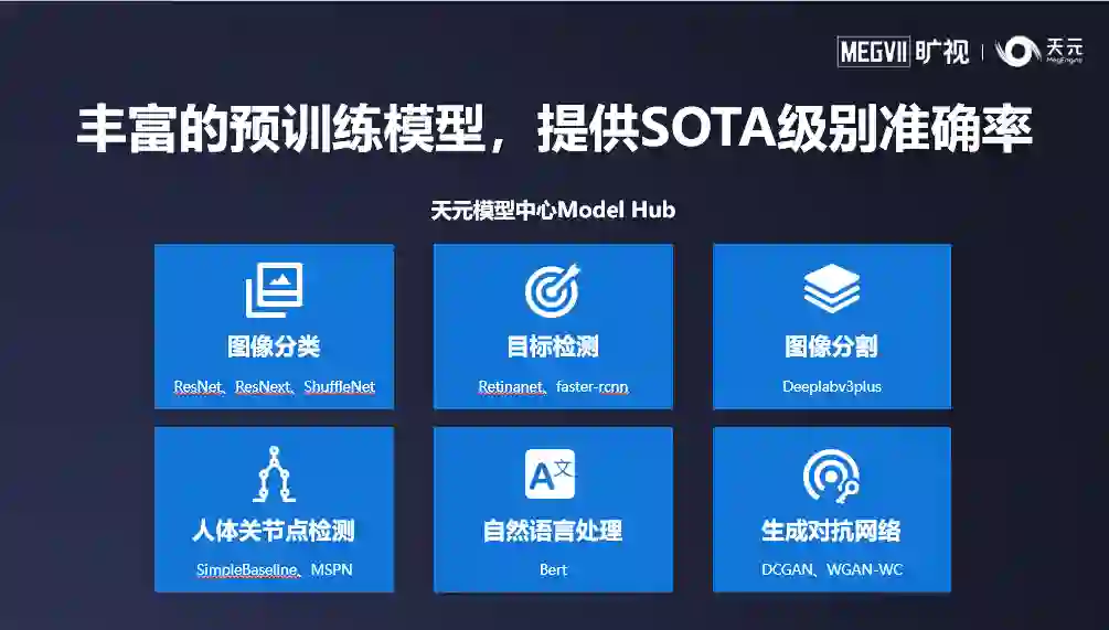 在使用上,天元模型中心 Model Hub 提供了丰富的预训练模型,包括图像分类、目标检测、图像分割等模型,并且每个模型都提供了 SOTA 级别准确率,让使用者可以便捷的上手天元,站在巨人的肩膀上开始自己的科研工作。